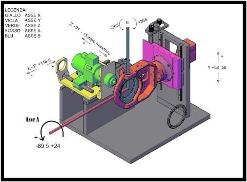 Questo progetto è stato commissionato dal cliente allo scopo di creare un sistema di autocompensazione della accidentale "stortura" degli assi in una fresa a 5 assi in continuo, per il settore dentale. Per perseguire le finalità del progetto, si è agito sia in maniera meccanica che agendo sul software. Infatti per evitare di ritarare meccanicamente gli assi di movimentazione del centro periodicamente, si è creata una strategia per la quale si faceva tastare una geometria rettificata e misurata, con una classe di precisione superiore della macchina, in modo da trovare le 5 coordinate di movimentazione (x, y, z, A, B). Una volta eseguita la routine di calibrazione e elaborando geometricamente i punti di contatto, a ritroso si andavano a trovare i versori dei 5 assi nelle coordinate assolute della macchina. Ovviamente ciascuno asse non sarà quello teorico (esempio x non sarò 1 0 0), ma sarà affetto da una rototraslazione (0.990 0.001 0.044) + (0.01 -